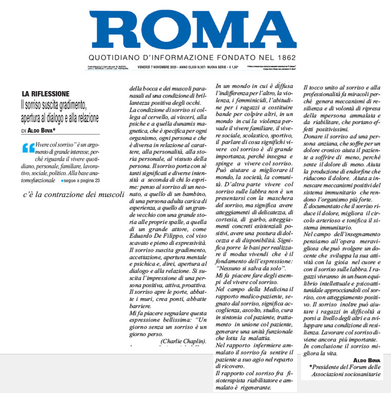 “Vivere col sorriso” è un argomento di grande interesse, perché riguarda il vivere quotidiano, personale, familiare, lavorativo, sociale, politico. Alla base anatomofunzionale c’è la contrazione dei muscoli della bocca e dei muscoli paranasali ed una condizione di brillantezza positiva degli occhi.