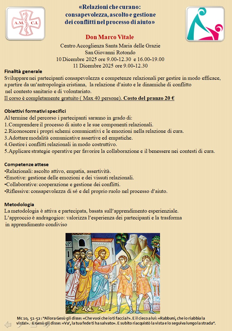 Home Puglia Sezione Diocesana di San Giovanni Rotondo «Relazioni che curano: consapevolezza, ascolto e gestione dei conflitti nel processo di...