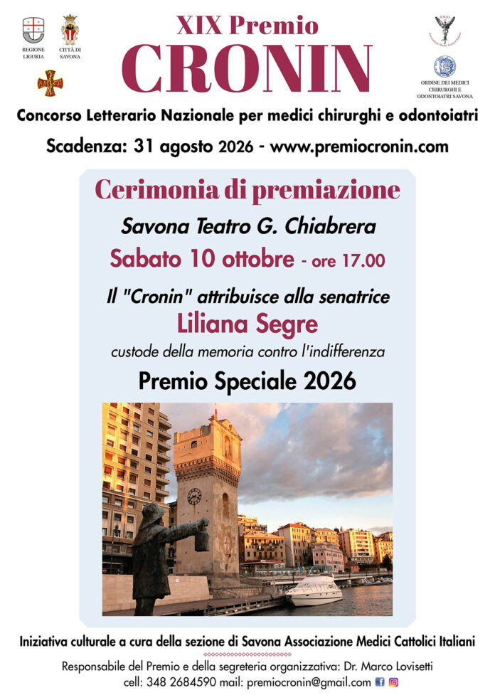 La direzione del Premio Cronin, nel descritto frangente, impreziosirà l’evento con l’attribuzione alla senatrice Liliana SEGRE custode della memoria contro l’indifferenza PREMIO SPECIALE 2026